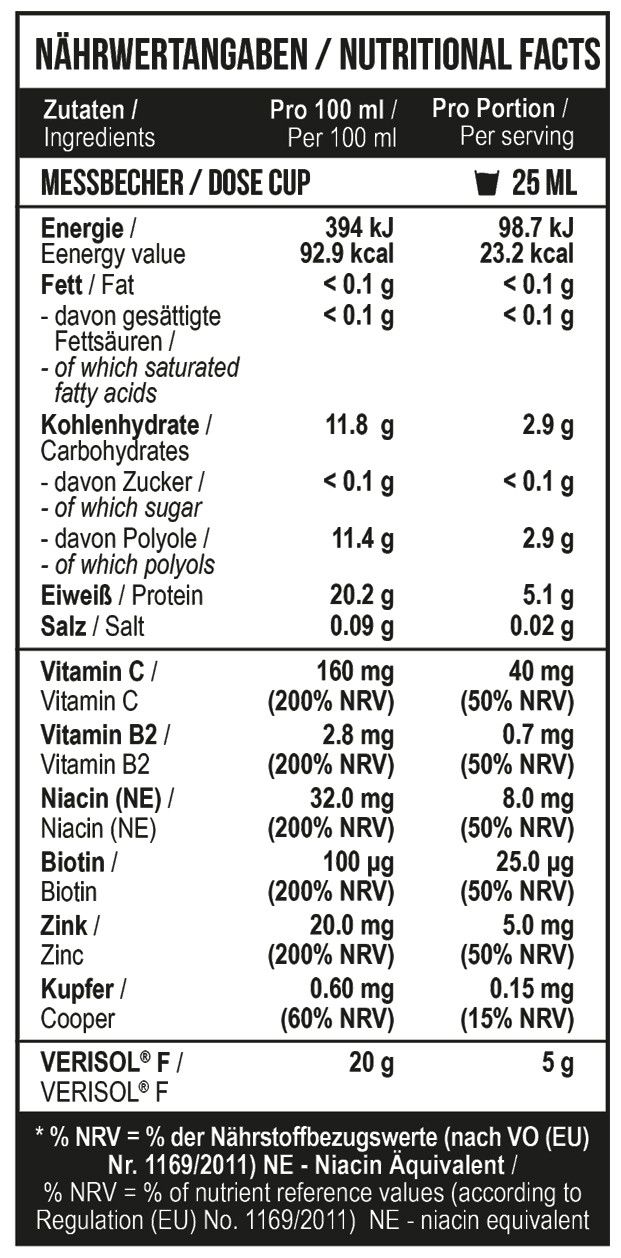 Інгредієнти: вода, гідролізат колагену (походження: VERISOL® F з риби), підсолоджувач (еритритол), кислота (молочна кислота), ароматизатор, L-аскорбінова кислота, консервант (бензоат натрію, сорбат калію), цитрат цинку, нікотинамід, підсолоджувачі (сукрало стевіол глікозиди), глюконат міді, рибофлавін, D-біотин.