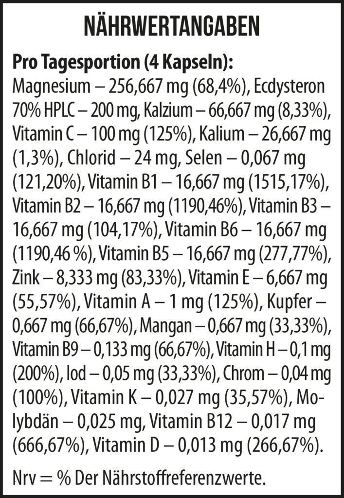 - до складу входить основний компонент Ecdysterone, тестований HPLC методом, це посилена форма препарату, що сприяє збільшенню анаболізму, що збільшує ріст м’язової маси, що дозволяє підвищити силу та витривалість;